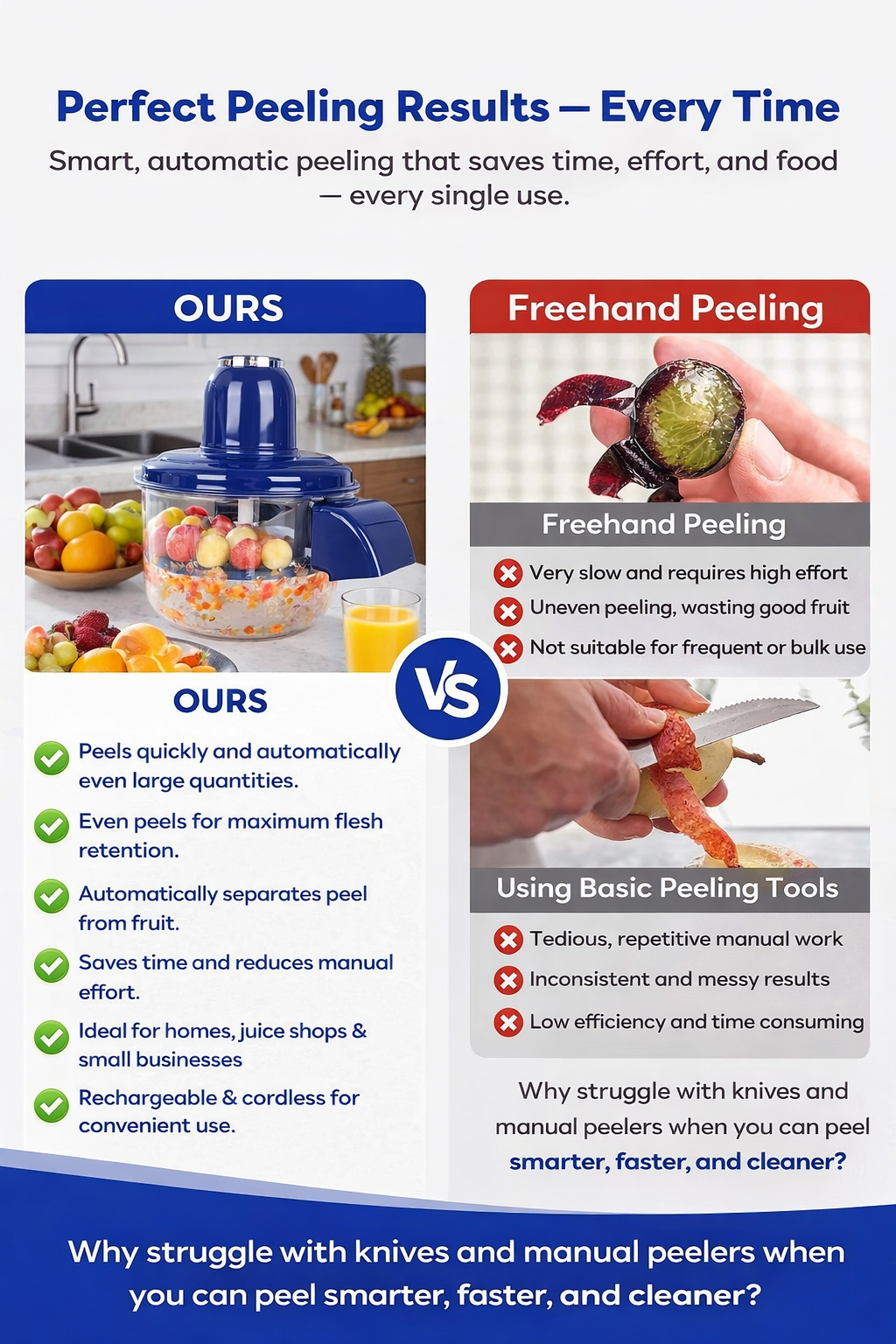 Say goodbye to slow, messy peeling. With just one press of a button, this Portable Automatic Electric Fruit & Vegetable Peeler delivers perfectly peeled fruit in just 25 seconds. Powered by a 50W high-performance motor, it works efficiently while staying quiet and cool thanks to smart cooling technology.